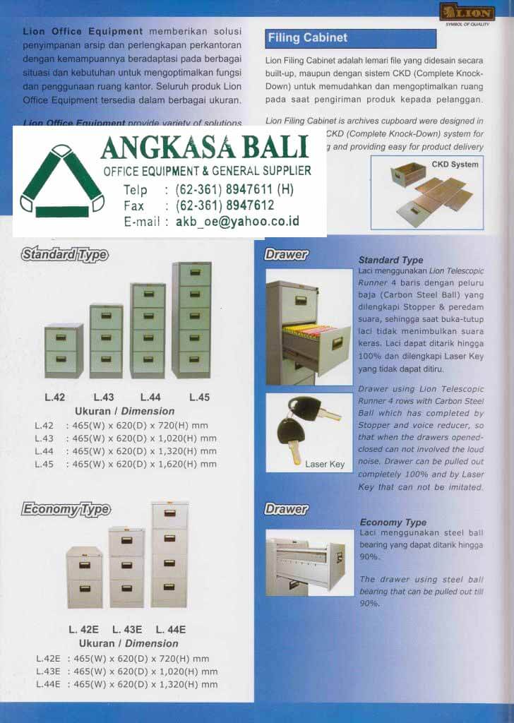 Filling Cabinet LionAngkasa Bali Kantor menyediakan filling cabinet Lion dengan harga jual murah di toko kami di Bali. Dengan menggunakan filling cabinet Lion, maka berkas, file dan arsip-arsip di kantor Anda akan tersimpan dengan rapi.Filling cabinet Lion tersedia dalam pilihan dua laci, tiga laci empat laci ataupun Lima laci, dengan bahan plat besi tebal dan cat powder coating .Anda dapat memilih filling cabinet sesuai dengan keperluan dan luas ruangan kantor Anda. Dengan menggunakan filling cabinet Lion yang awet dan berkualitas, maka Anda akan mudah menata berkas dan barang yang Anda miliki sehingga lebih muda di cari.